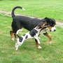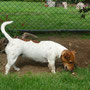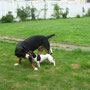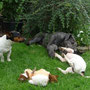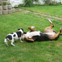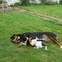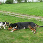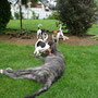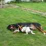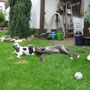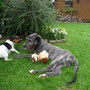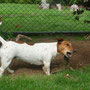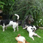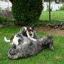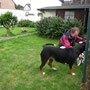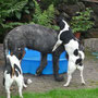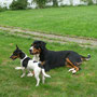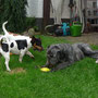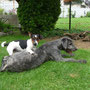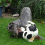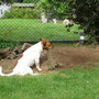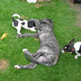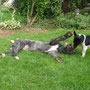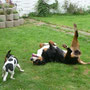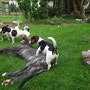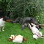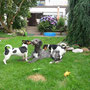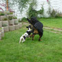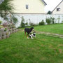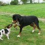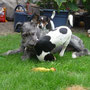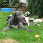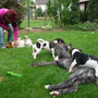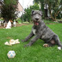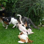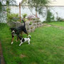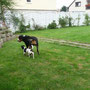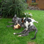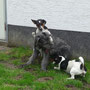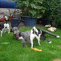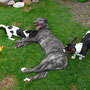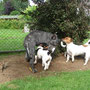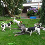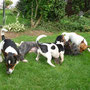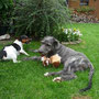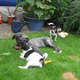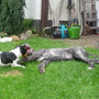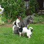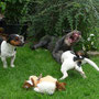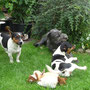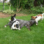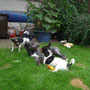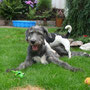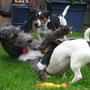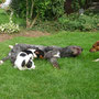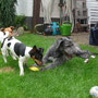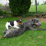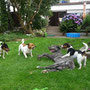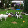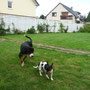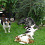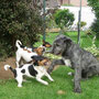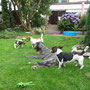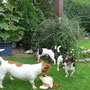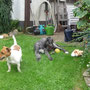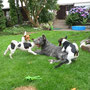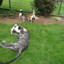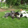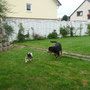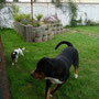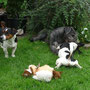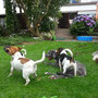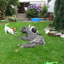 Bei unserer heutigen Gassirunde sind wir zufällig unser alten Bekannten Martina & Lucy der knuffigen 3 Monate alten Irischen Wolfshündin begegnet und haben sie kurze Hand zum spielen in unseren Garten eingeladen. Damit Zaungast Emma, unsere Nachbarshündin, nicht nur traurig zuschauen musste, hat Jappo einen Ausflug in Nachbars Garten gemacht.